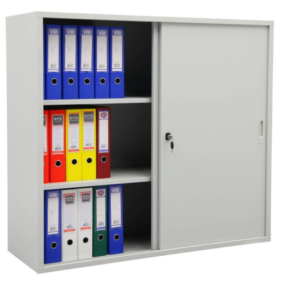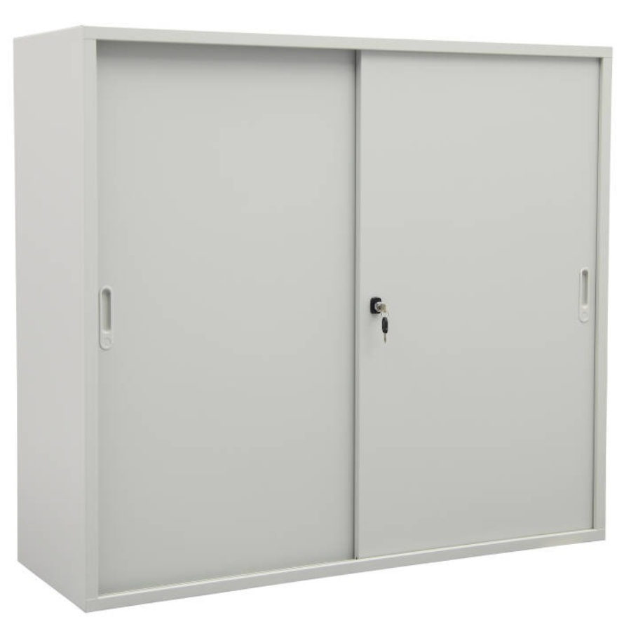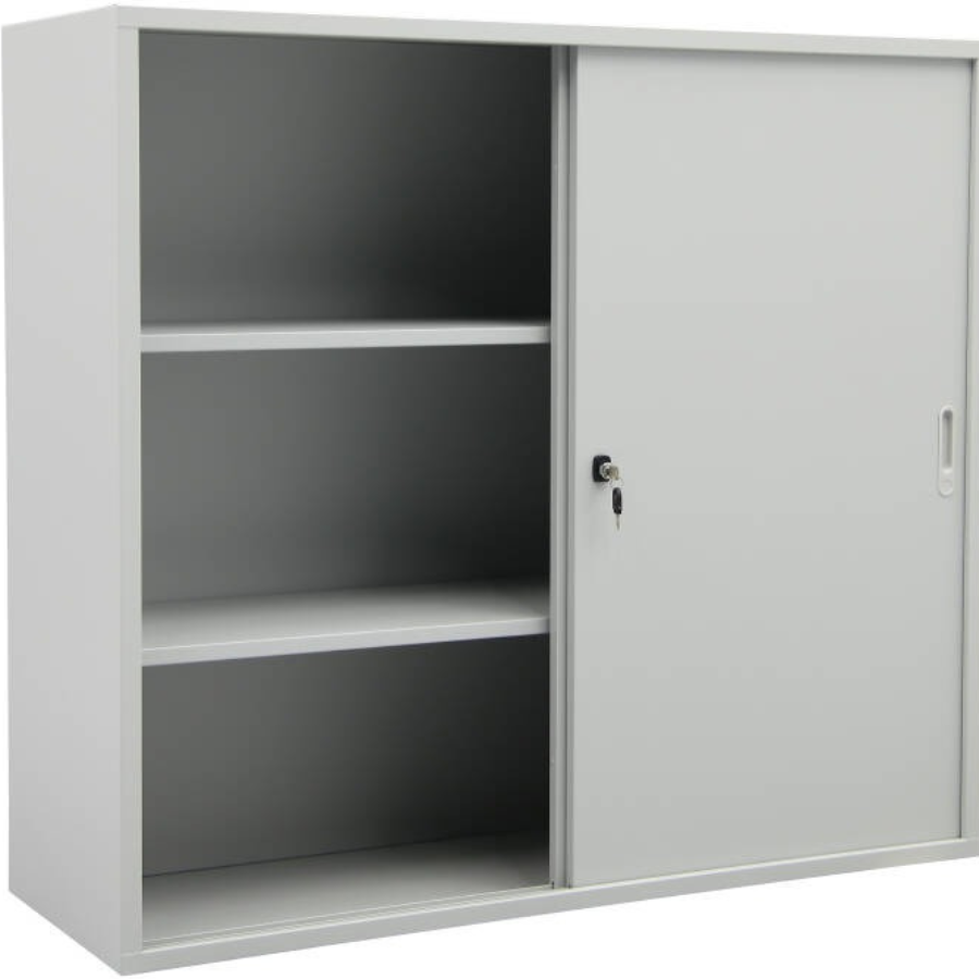 Cette armoire à portes coulissantes est fabriquée en tôle d'acier solide avec un revêtement en poudre gris clair. Les portes coulissantes sont guidées sur des rails sur roulettes à roulement à billes. L'armoire est livrée avec une serrure à cylindre tourner/pousser avec 2 clés.