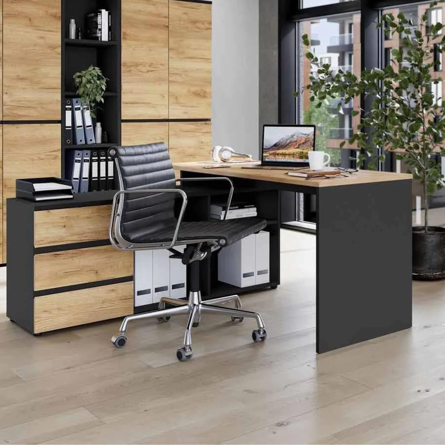 Le bureau d'angle 4187 Lisbon allie design moderne et fonctionnalité pratique, créant un environnement de travail élégant. Le corps en graphite et le plateau de table et les façades des tiroirs en chêne de Navarre forment une combinaison de couleurs harmonieuse qui s'intègre dans n'importe quel bureau. Grâce au revêtement en résine mélamine, les surfaces sont résistantes aux rayures et durables, tandis que les bords en ABS de haute qualité sont résistants aux chocs et aux impacts.