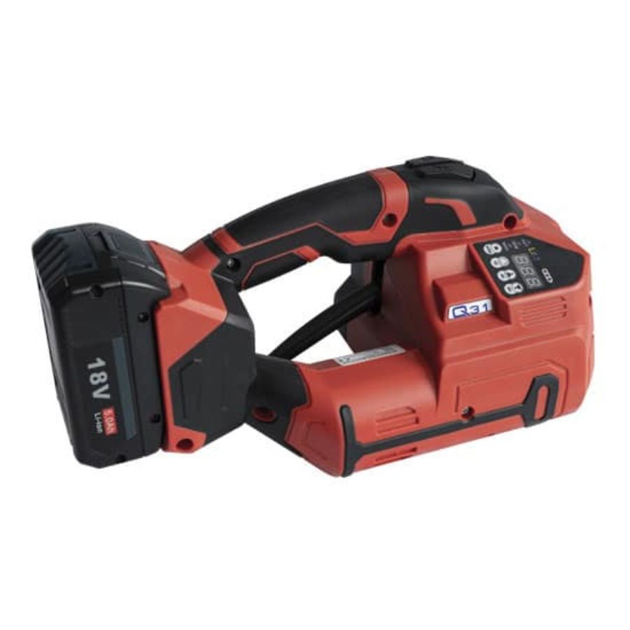Grâce à ces caractéristiques, le Q31 est extrêmement polyvalent et peut être utilisé sur différents lieux de travail. L'opération à une main, économe en énergie, garantit non seulement efficacité et ergonomie, mais permet également de tendre et de souder sans effort le cerclage en position horizontale, verticale ou en hauteur.