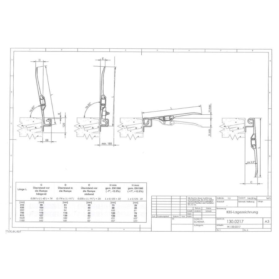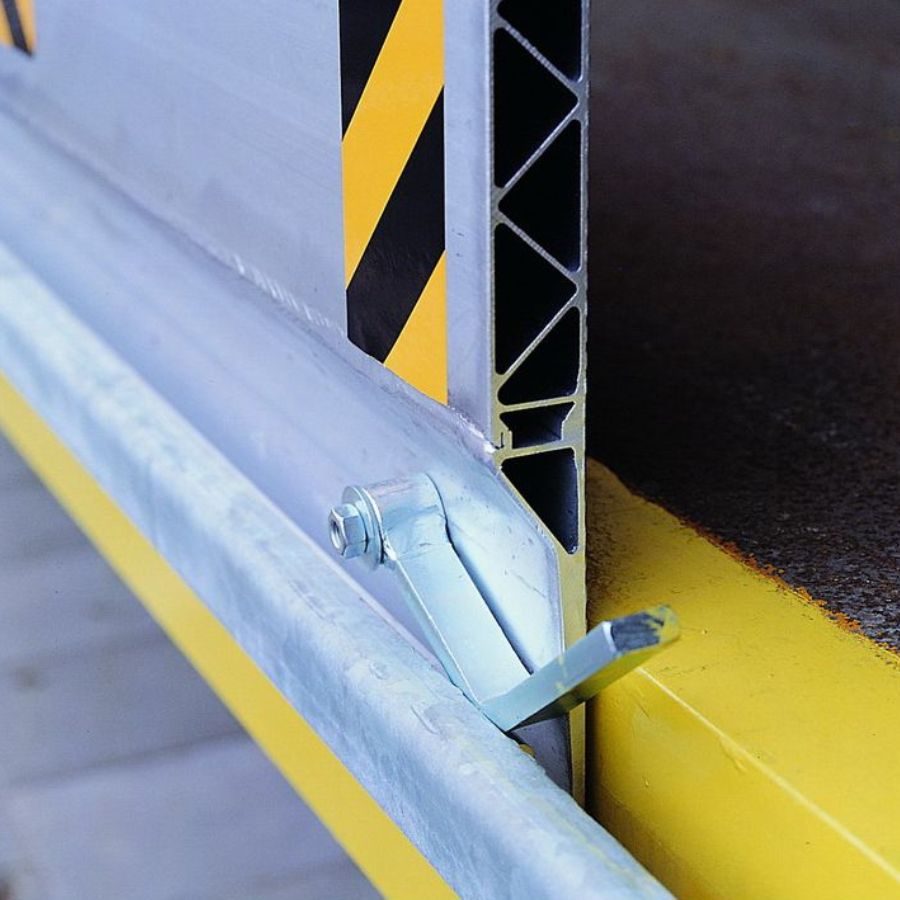 Pont roulant en aluminium peu encombrant avec protection automatique contre les chutes. Le pont traversant peut être déplacé latéralement dans des rails (profils en U) qui peuvent être encastrés dans la rampe. Lorsqu'il n'est pas utilisé, le pont traversant peut être replié verticalement sur le bord de la rampe